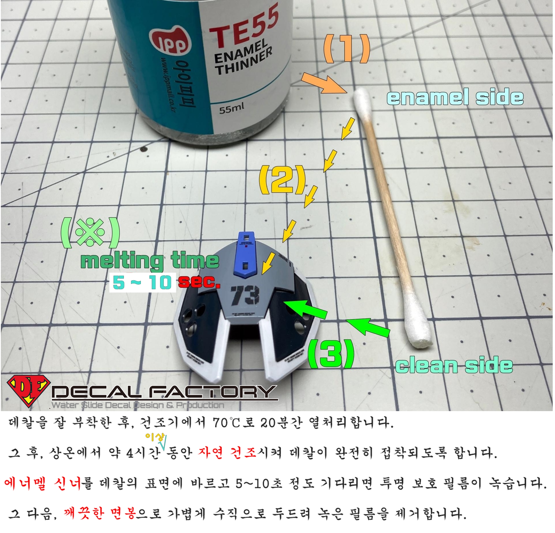 에너멜 신너를 데칼 표면에 적당량 바른 후 5~10초 정도 기다리면 코팅이 녹습니다.