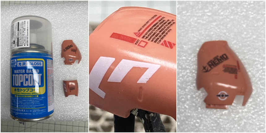 군제 탑 코트 유광 마감을 뿌린 표면에 데칼 붙이기를 한 경우입니다.데칼을 잘 붙인 후 4시간 이상 자연 건조를 확실하게 한 후 코팅을 제거하였습니다.