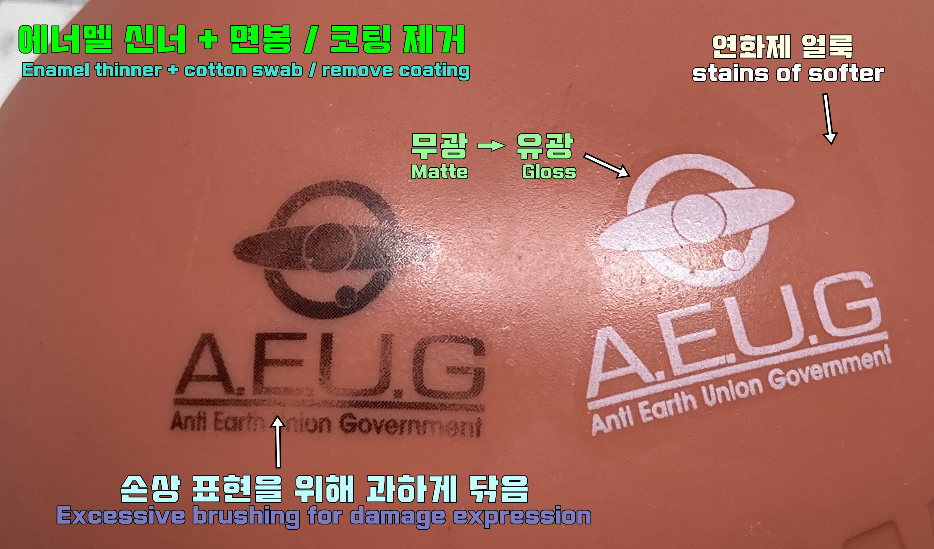 이런 경우에는 "군제 탑 코트 유광마감" 위에 데칼을 붙이는 것이 테스트 결과 가장 좋은 방법으로 나타났습니다.