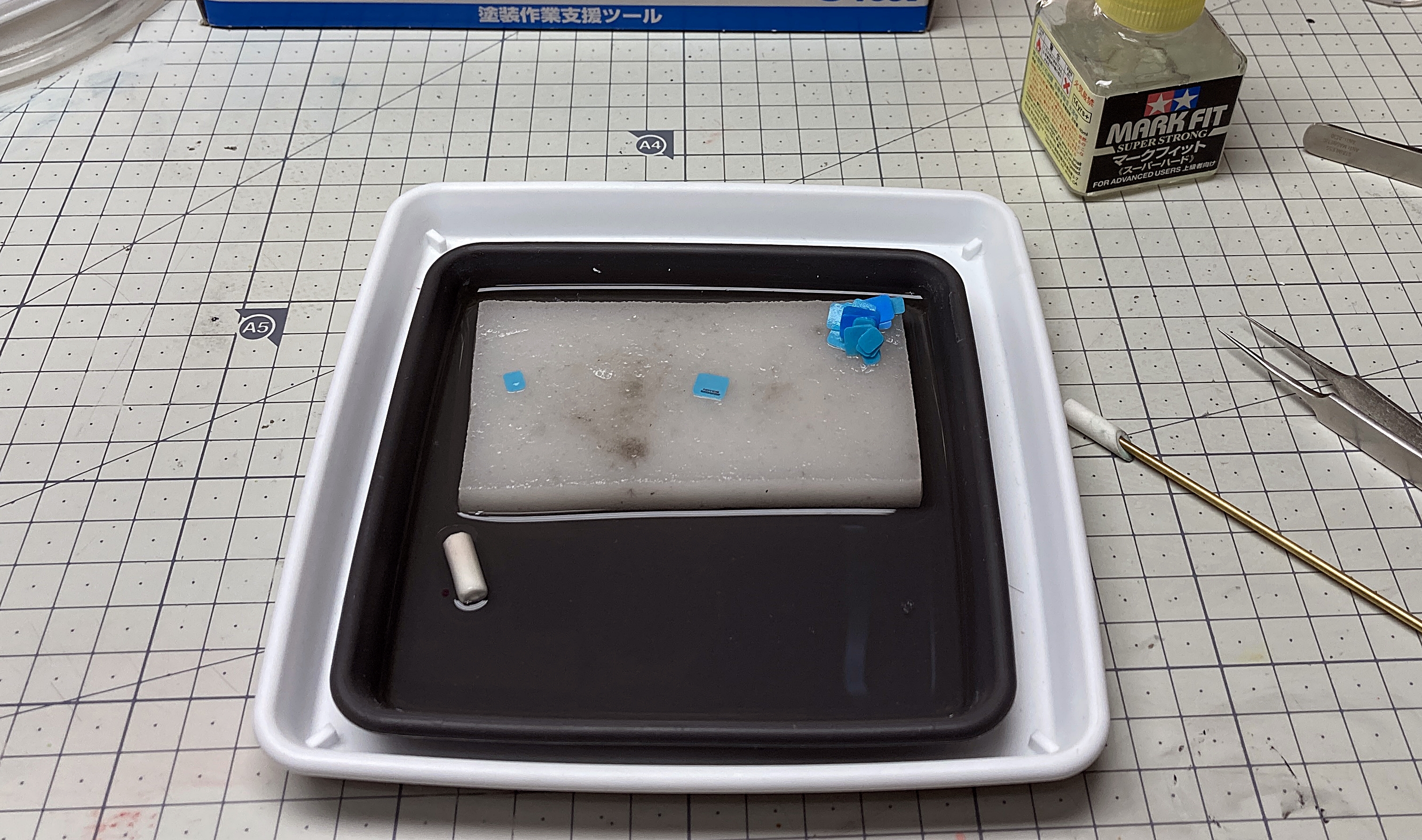 파란색 데칼 용지 때문에 데칼이랑 하단의 스펀지와 약간의 공간이 생기기 때문에 핀셋으로 집기 쉽게 됩니다.
