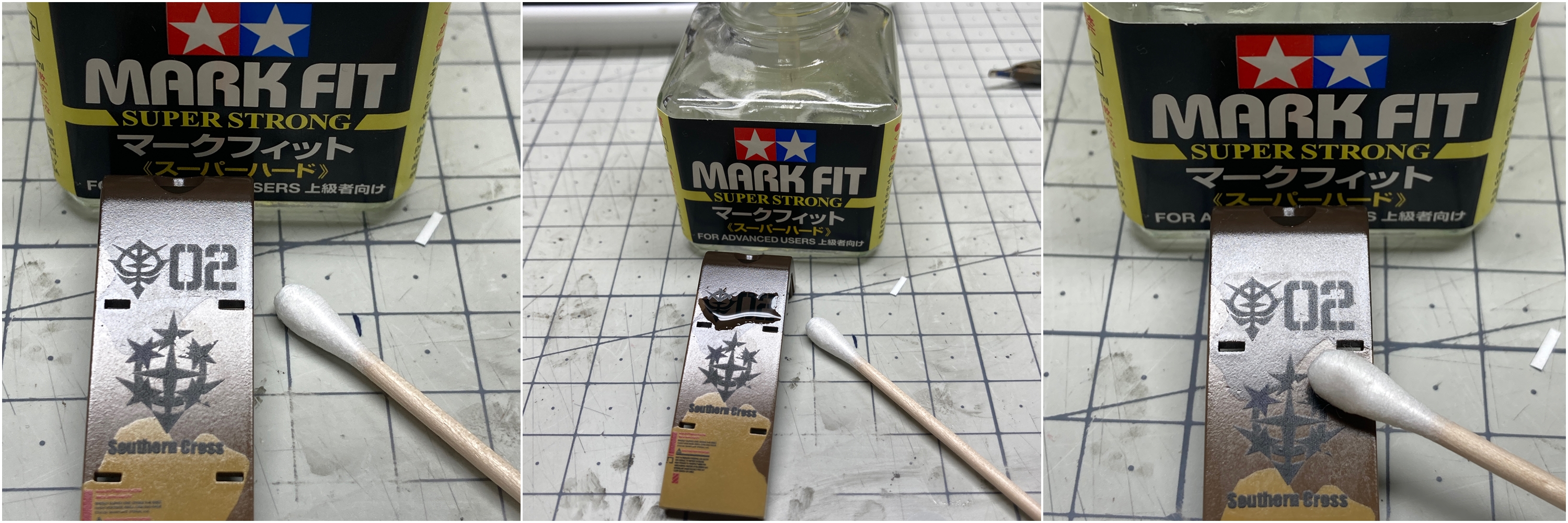 코팅이 제거된 표면에 마크핏(데칼연화제)를 발라준 후 약간 기다렸다가 면봉으로 가볍게 문질러서 닦아내면 깔끔하게 됩니다.