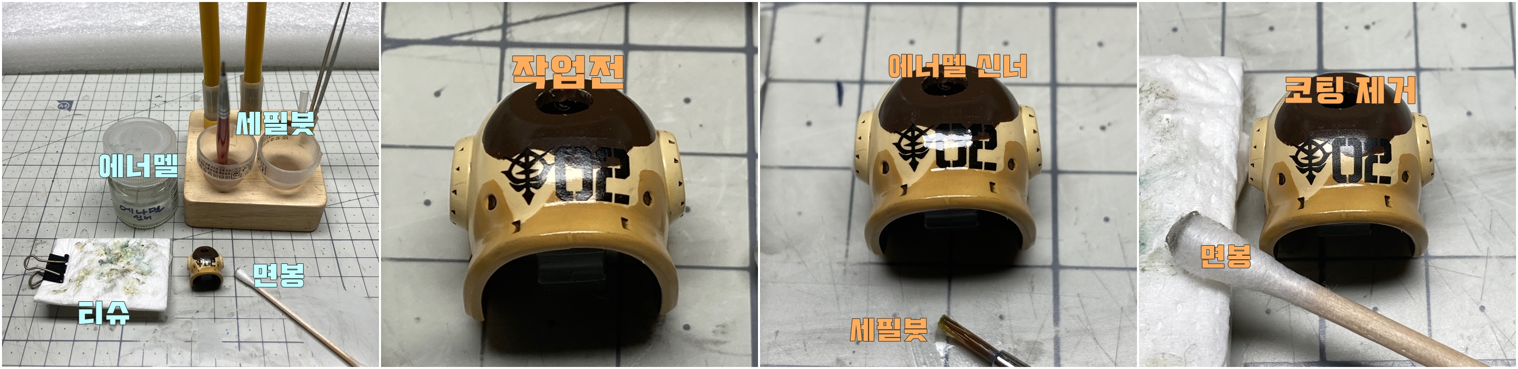 데칼 코팅은 에너멜 신너로 녹여서 면봉으로 제거할 수 있습니다.