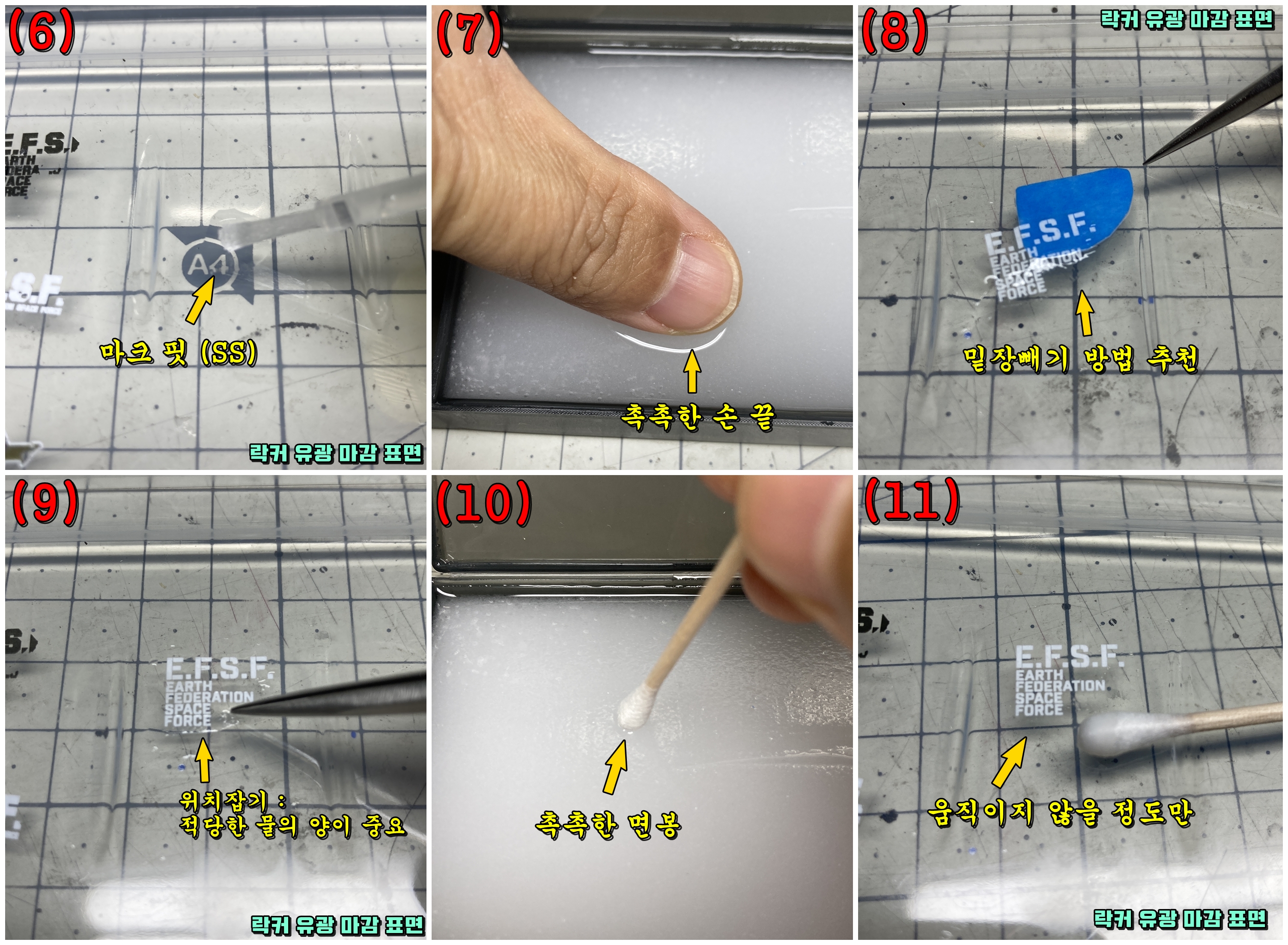 세필붓으로 에너멜 신너를 데칼의 표면에 바른 후 10초 정도 기다린 후 면봉으로 가볍게 톡톡 찍어서 코팅을 제거하면 됩니다.